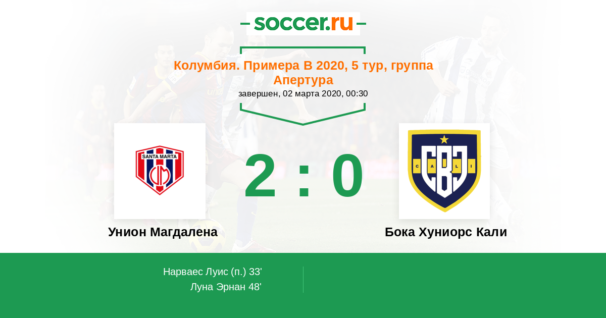 Колумбия. Примера B 12.02.2021 Бока Хуниорс Кали Логотип футбольный клуб Бока Хуниорс Кали (Сантьяго-де-Кали) 0:1 Логотип футбольный клуб Унион Магдалена (Санта Марта) Унион Магдалена