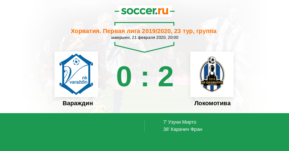 Хорватия. Первая лига 30.06.2020 Локомотива Логотип футбольный клуб Локомотива (Загреб) 2:0 Логотип футбольный клуб Вараждин Вараждин