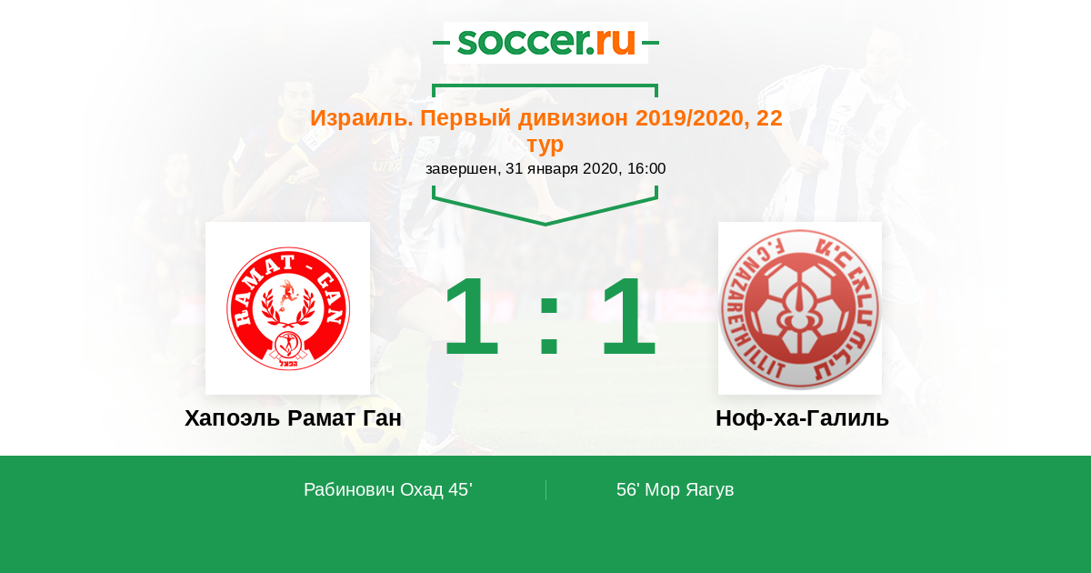 Израиль. Первый дивизион 23.01.2015 Ноф-ха-Галиль Логотип футбольный клуб Ноф-ха-Галиль (Назарет Иллит) 1:1 Логотип футбольный клуб Хапоэль Рамат Ган Хапоэль Рамат Ган