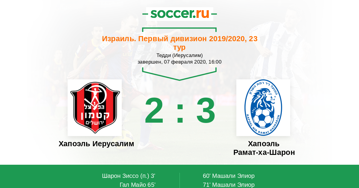 Израиль. Первый дивизион 26.02.2016 Хапоэль Иерусалим Логотип футбольный клуб Хапоэль Иерусалим 1:0 Логотип футбольный клуб Хапоэль Рамат-ха-Шарон Хапоэль Рамат-ха-Шарон