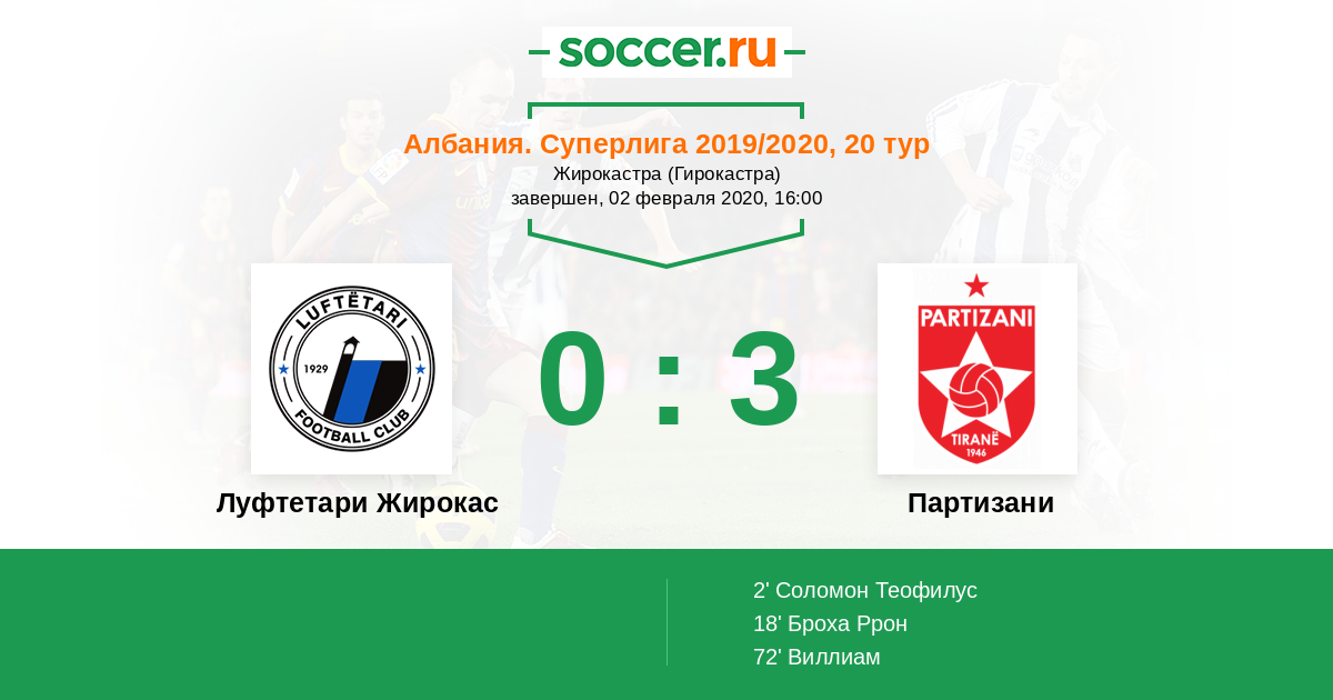 Албания. Суперлига 03.11.2019 Партизани Логотип футбольный клуб Партизани (Тирана) 2:0 Логотип футбольный клуб Луфтетари Жирокас (Жирокастер) Луфтетари Жирокас