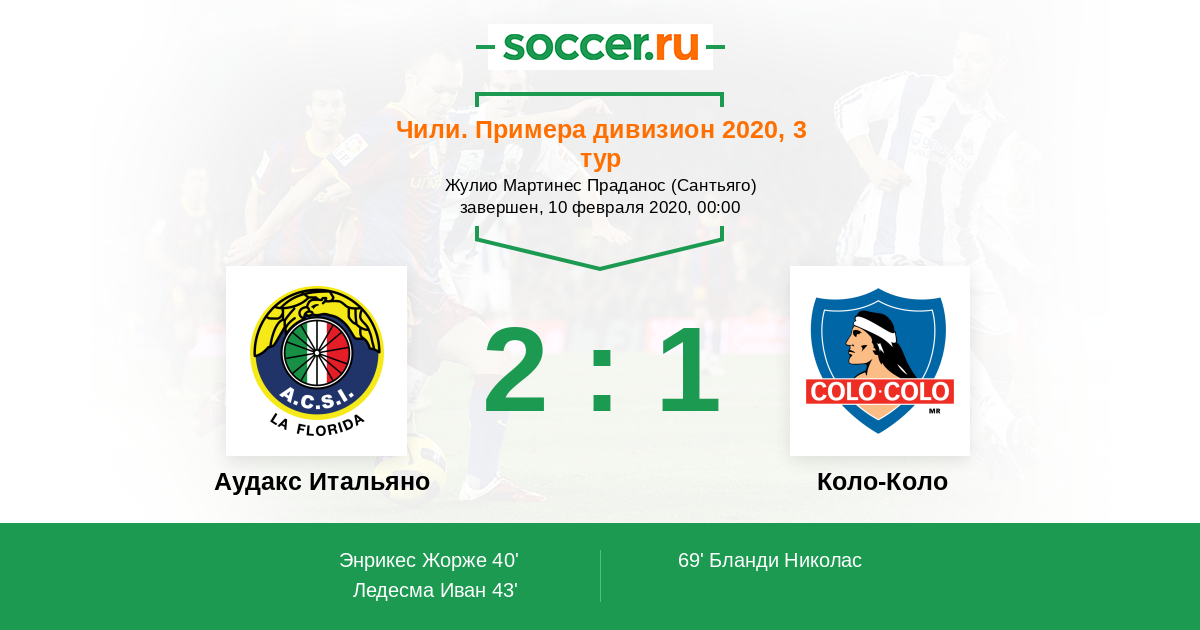 Чили. Примера дивизион 12.02.2018 Коло-Коло Логотип футбольный клуб Коло-Коло (Сантьяго) 3:2 Логотип футбольный клуб Аудакс Итальяно (Сантьяго) Аудакс Итальяно