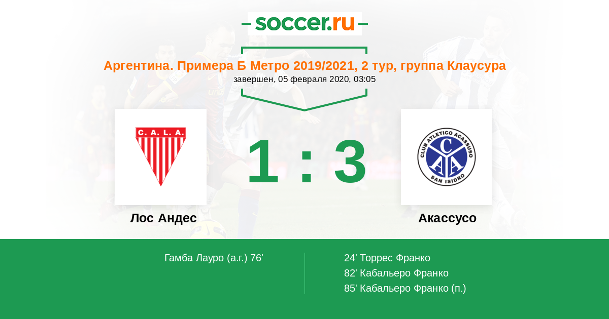 Аргентина. Примера Б Метро 29.01.2013 Акассусо Логотип футбольный клуб Акассусо (Сан-Исидро) 1:0 Логотип футбольный клуб Лос Андес (Ломас-де-Самора) Лос Андес