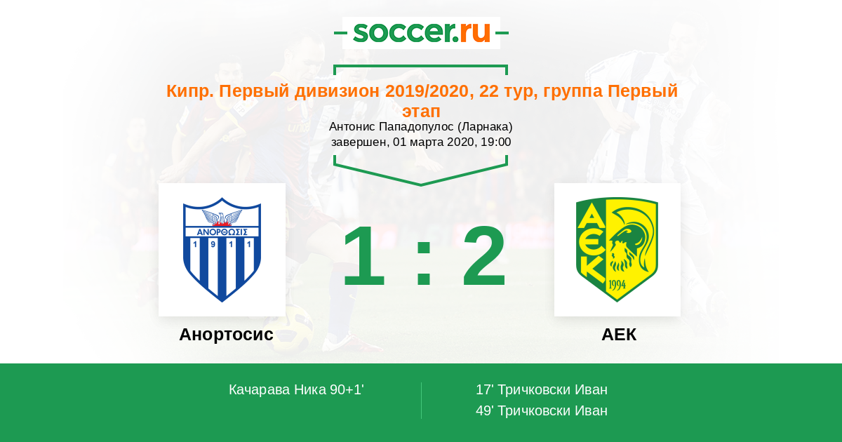 Кипр. Первый Дивизион 03.03.2018 АЕК Логотип футбольный клуб АЕК (Ларнака) 2:2 Логотип футбольный клуб Анортосис (Ларнака) Анортосис
