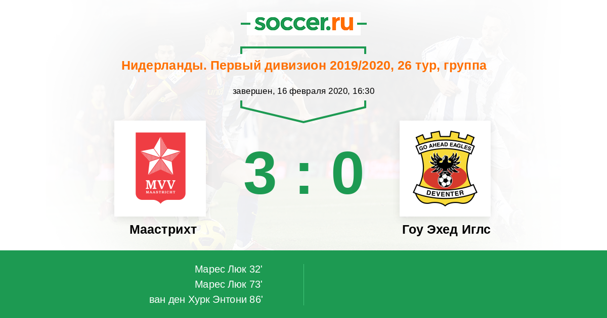 Нидерланды. Первый дивизион 01.03.2019 Гоу Эхед Иглс Логотип футбольный клуб Гоу Эхед Иглс (Девентер) 2:0 Логотип футбольный клуб Маастрихт Маастрихт
