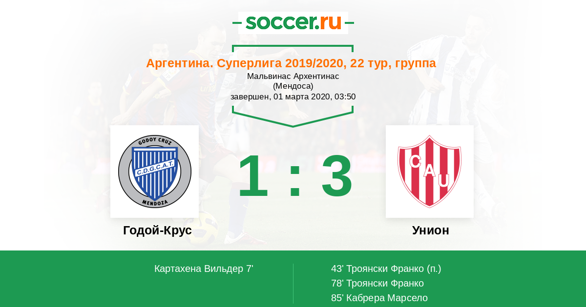 Аргентина. Суперлига 26.07.2022 Унион Логотип футбольный клуб Унион (Санта-Фе) 2:1 Логотип футбольный клуб Годой-Крус Годой-Крус