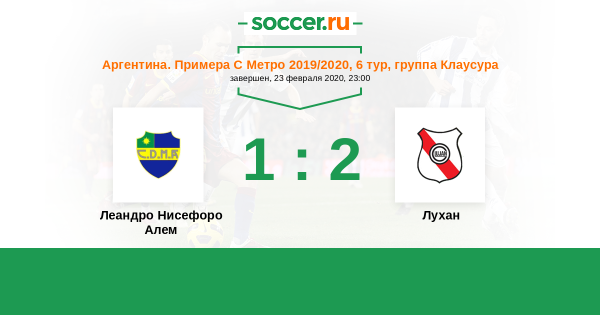 Аргентина. Примера С Метро 01.09.2019 Лухан Логотип футбольный клуб Лухан 1:2 Логотип футбольный клуб Леандро Нисефоро Алем (Буэнос-Айрес) Леандро Нисефоро Алем