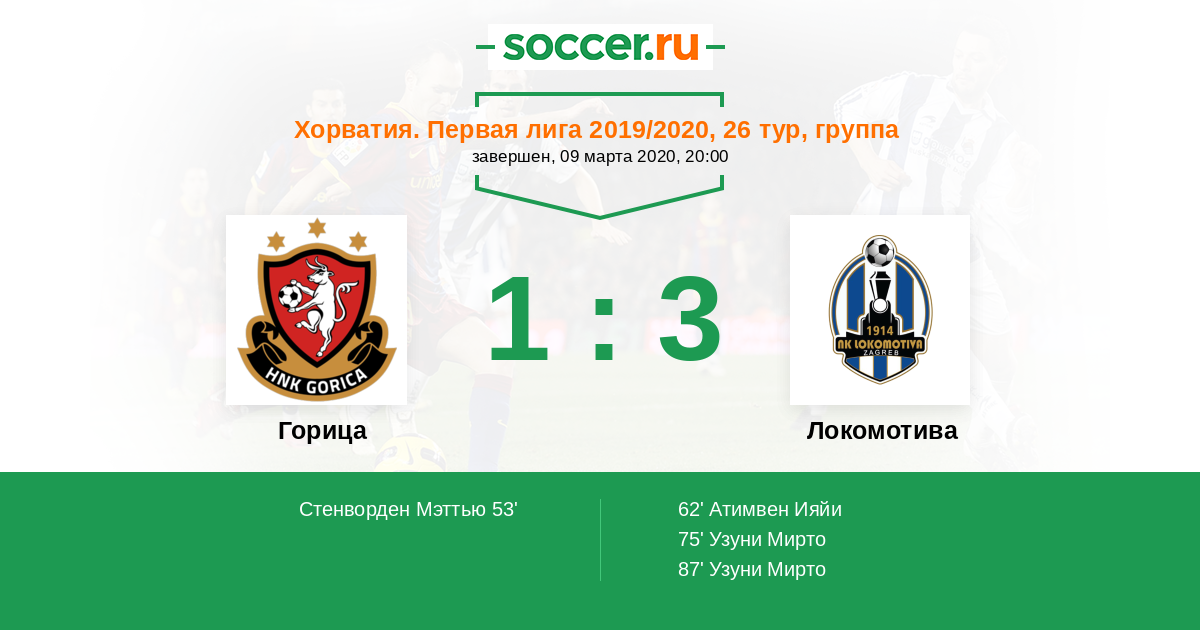 Хорватия. Первая лига 19.07.2020 Локомотива Логотип футбольный клуб Локомотива (Загреб) 1:1 Логотип футбольный клуб Горица (Велика Горица) Горица