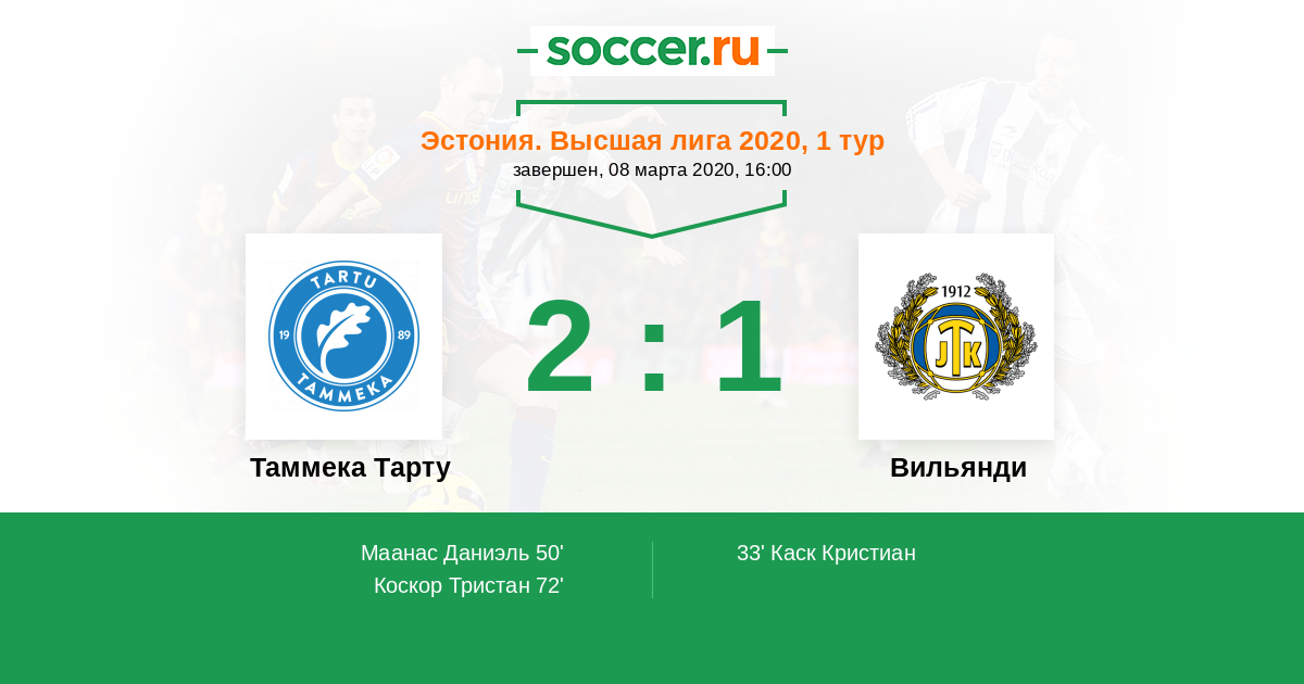 Эстония. Высшая лига 07.04.2018 Вильянди Логотип футбольный клуб Вильянди 0:2 Логотип футбольный клуб Таммека Тарту Таммека Тарту