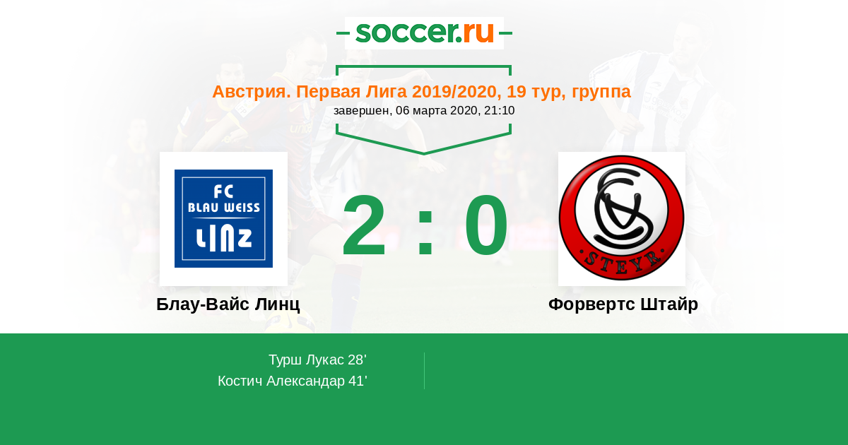 Австрия. Первая Лига 08.11.2020 Форвертс Штайр Логотип футбольный клуб Форвертс Штайр 1:1 Логотип футбольный клуб Блау-Вайс Линц Блау-Вайс Линц