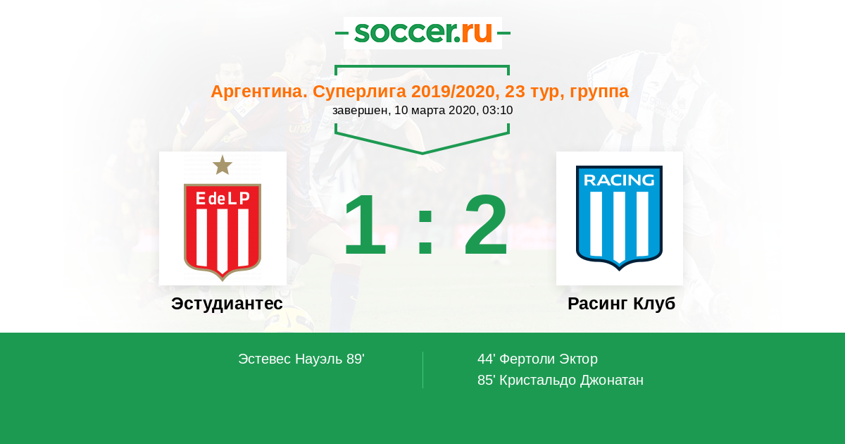 Аргентина. Суперлига 07.05.2018 Эстудиантес Логотип футбольный клуб Эстудиантес (Ла-Плата) 1:2 Логотип футбольный клуб Расинг Клуб (Авельянеда) Расинг Клуб