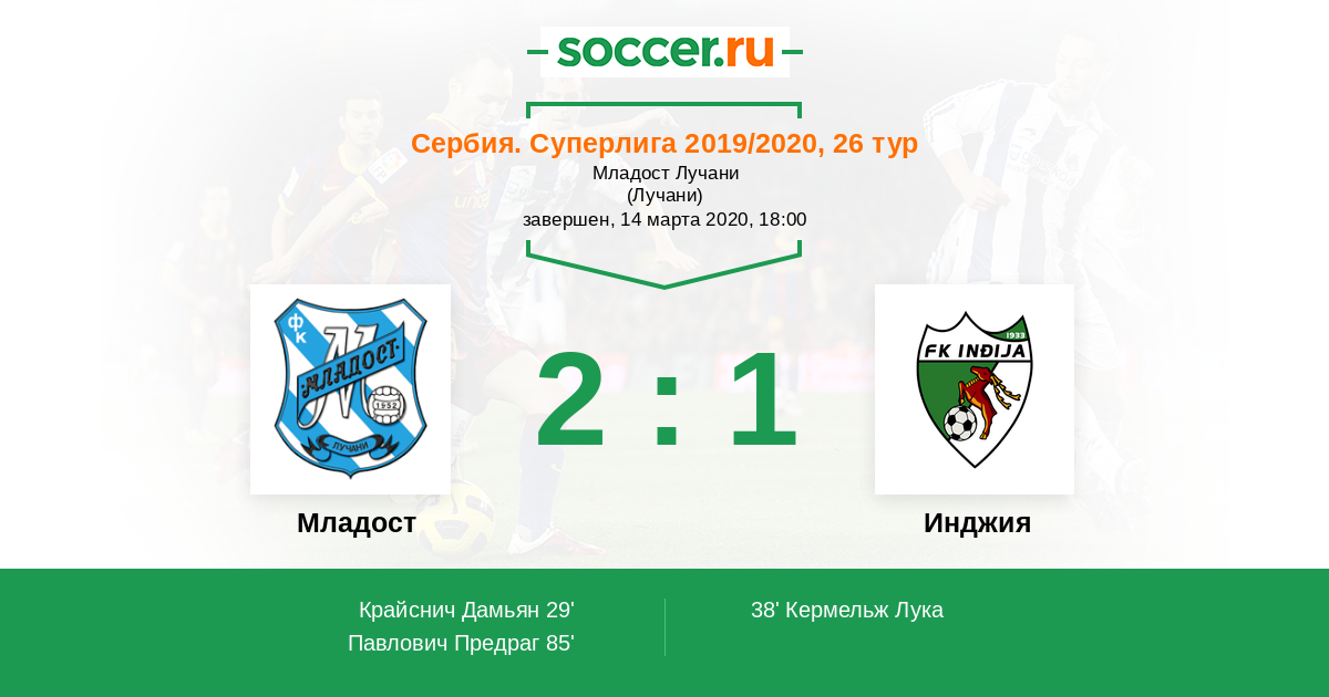 Сербия. Суперлига 09.08.2020 Младост Логотип футбольный клуб Младост (Лучани) 2:0 Логотип футбольный клуб Инджия Инджия