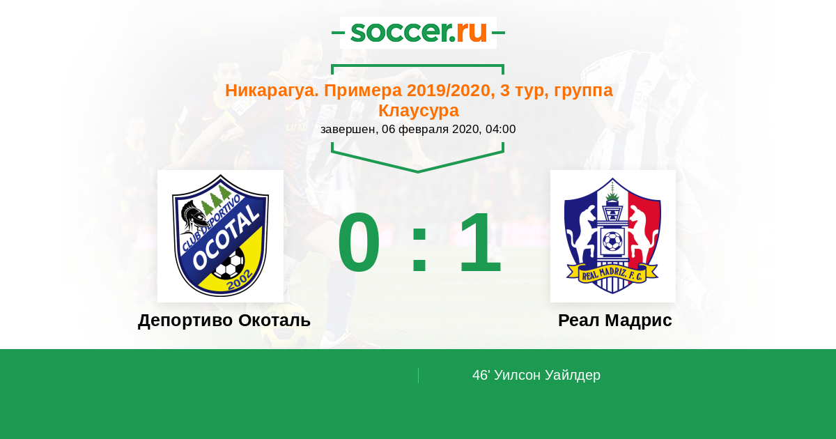 Никарагуа. Примера 21.10.2019 Депортиво Окоталь Логотип футбольный клуб Депортиво Окоталь 1:1 Логотип футбольный клуб Реал Мадрис (Сомото) Реал Мадрис