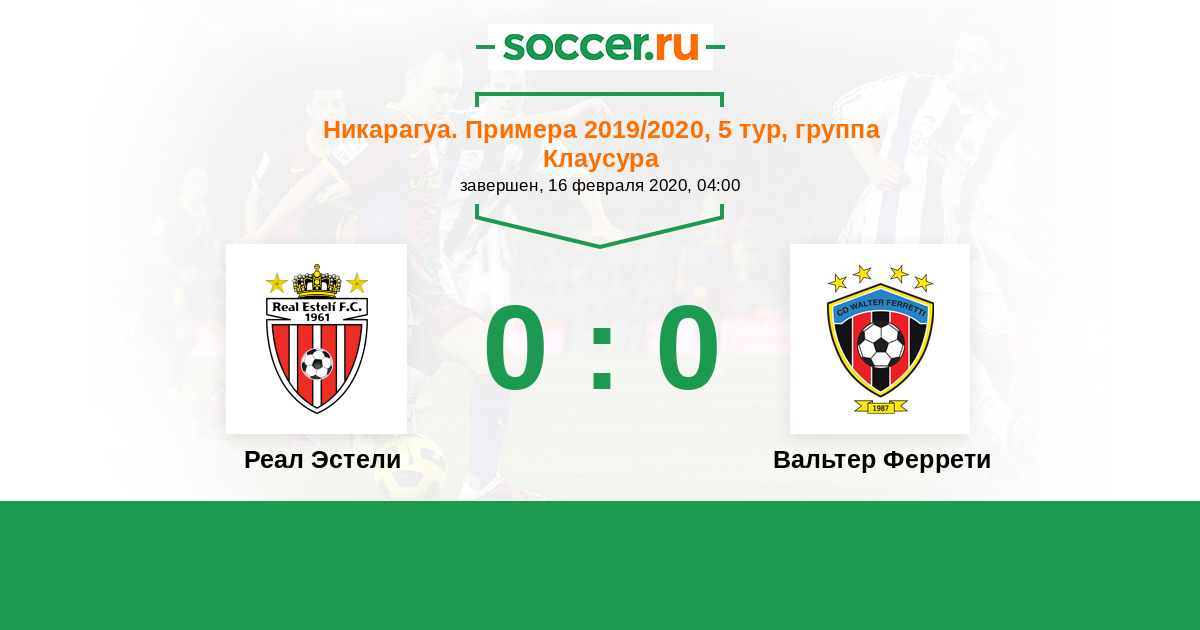 Никарагуа. Примера 06.04.2020 Вальтер Феррети Логотип футбольный клуб Вальтер Феррети (Манагуа) 1:0 Логотип футбольный клуб Реал Эстели Реал Эстели