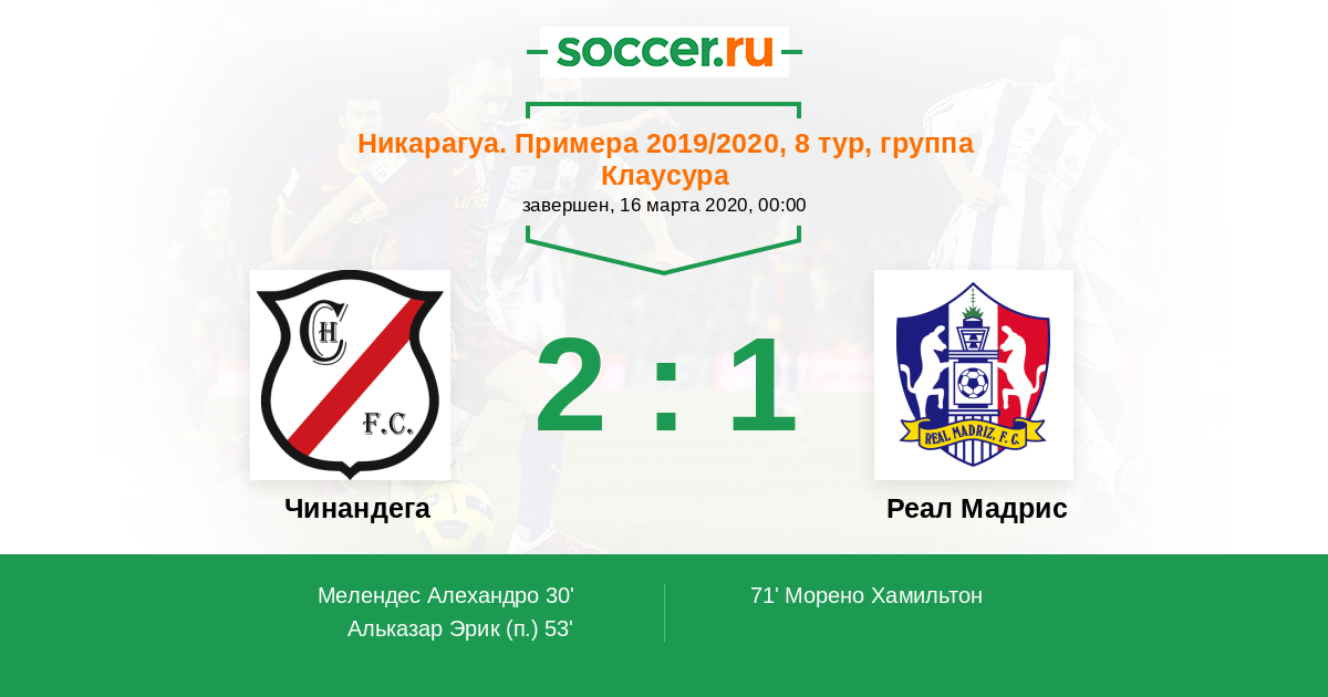 Никарагуа. Примера 16.04.2020 Реал Мадрис Логотип футбольный клуб Реал Мадрис (Сомото) 2:0 Логотип футбольный клуб Чинандега (Ла Веранера) Чинандега