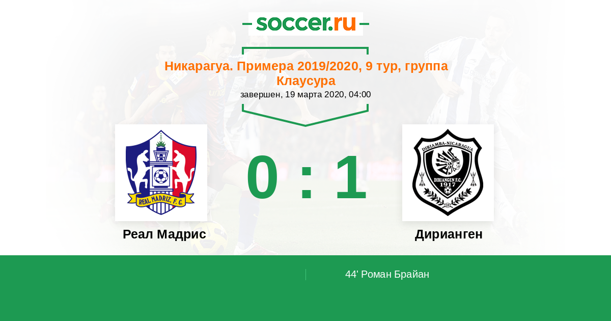 Никарагуа. Примера 19.04.2020 Дирианген Логотип футбольный клуб Дирианген (Дириамба) 3:1 Логотип футбольный клуб Реал Мадрис (Сомото) Реал Мадрис