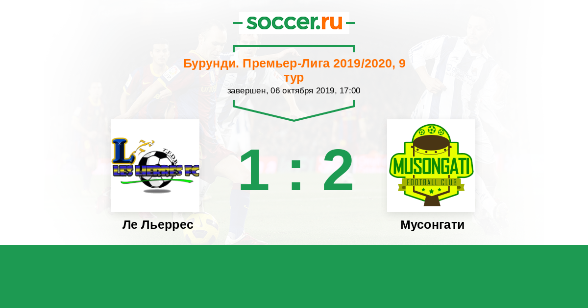 Бурунди. Премьер-лига 23.02.2020 Ле Льеррес Логотип футбольный клуб Ле Льеррес (Бужумбура) 0:2 Логотип футбольный клуб Мессаже де Нгози Мессаже де Нгози