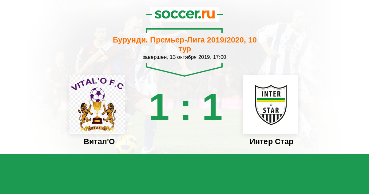 Бурунди. Премьер-лига 30.05.2020 Интер Стар Логотип футбольный клуб Интер Стар (Бужумбура) 2:1 Логотип Витал'O Витал'O