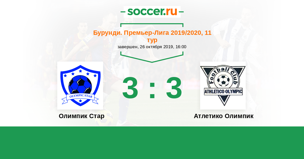 Бурунди. Премьер-лига 26.01.2020 Атлетико Олимпик Логотип футбольный клуб Атлетико Олимпик 3:3 Логотип футбольный клуб Олимпик Стар (Муйинга) Олимпик Стар
