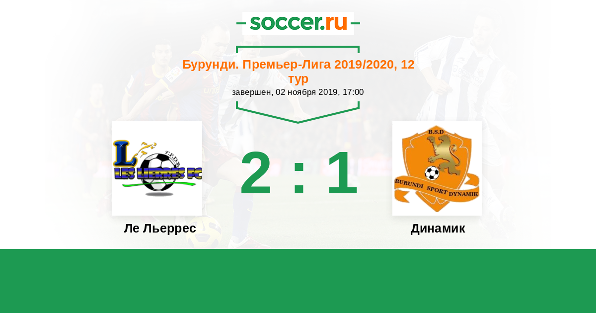 Бурунди. Премьер-лига 07.03.2020 Динамик Логотип футбольный клуб Динамик (Бужумбура) 1:0 Логотип футбольный клуб Ле Льеррес (Бужумбура) Ле Льеррес