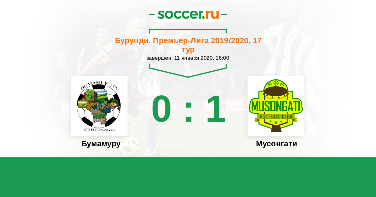 Бурунди. Премьер-лига 10.11.2019 Мусонгати Логотип футбольный клуб Мусонгати (Гитега) 0:0 Логотип футбольный клуб Бумамуру (Буганда) Бумамуру