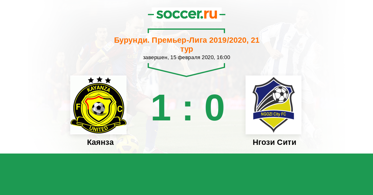 Бурунди. Премьер-лига 15.02.2020 Каянза Логотип футбольный клуб Каянза (Муйинга) 1:0 Логотип футбольный клуб Нгози Сити (Мвумба) Нгози Сити