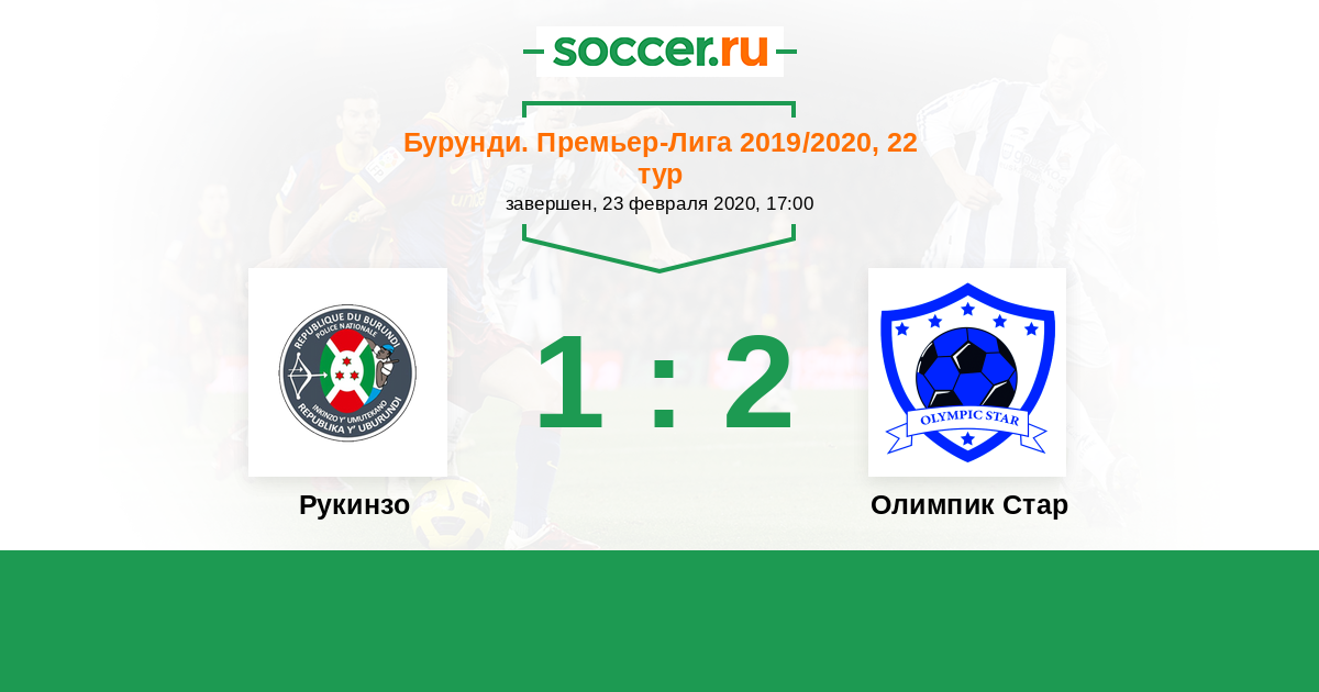 Бурунди. Премьер-лига 23.02.2020 Рукинзо Логотип футбольный клуб Рукинзо (Бужумбура) 1:2 Логотип футбольный клуб Олимпик Стар (Муйинга) Олимпик Стар