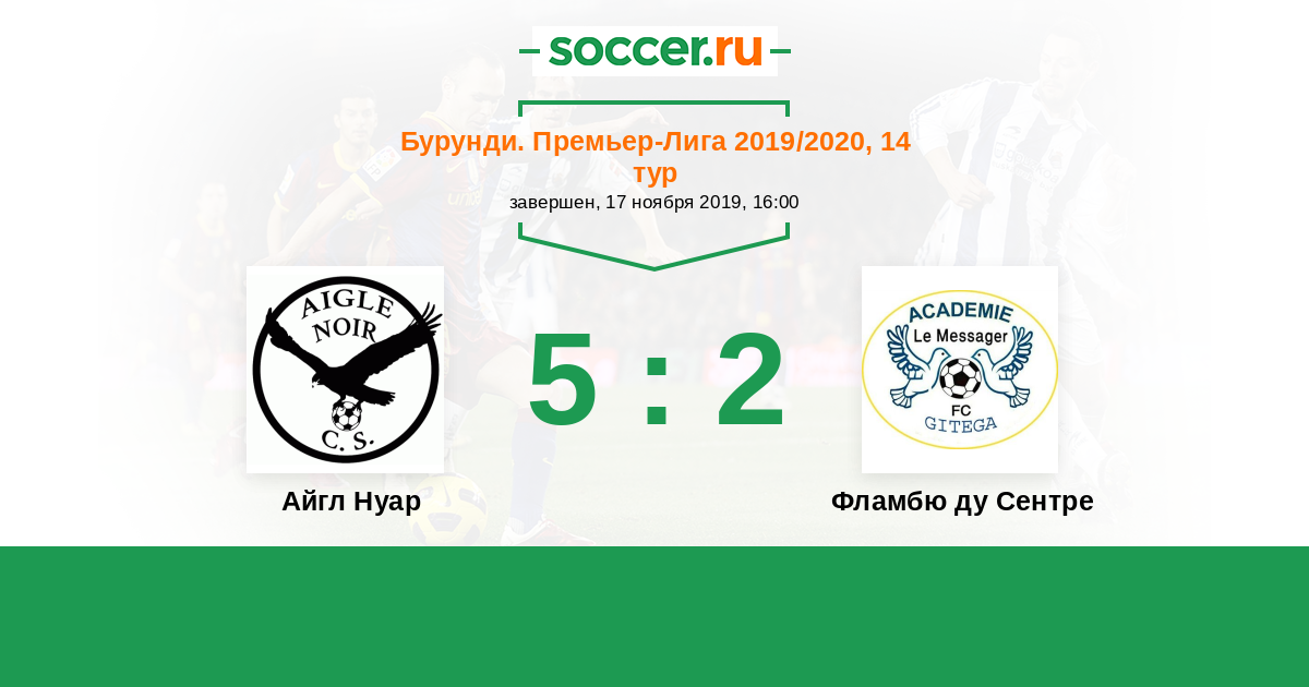 Бурунди. Премьер-лига 30.05.2020 Фламбю ду Сентре Логотип футбольный клуб Фламбю ду Сентре (Гитега) 0:0 Логотип футбольный клуб Айгл Нуар (Макамба) Айгл Нуар