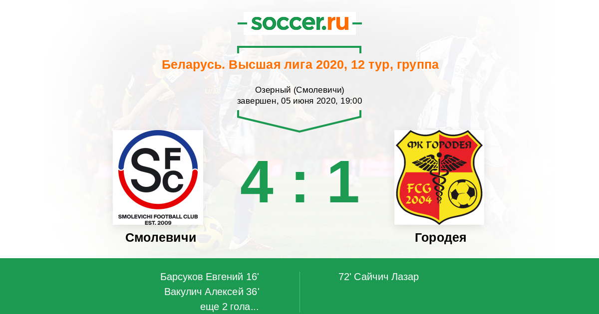 Беларусь. Высшая лига 11.06.2018 Смолевичи Логотип футбольный клуб Смолевичи 2:0 Логотип футбольный клуб Городея Городея