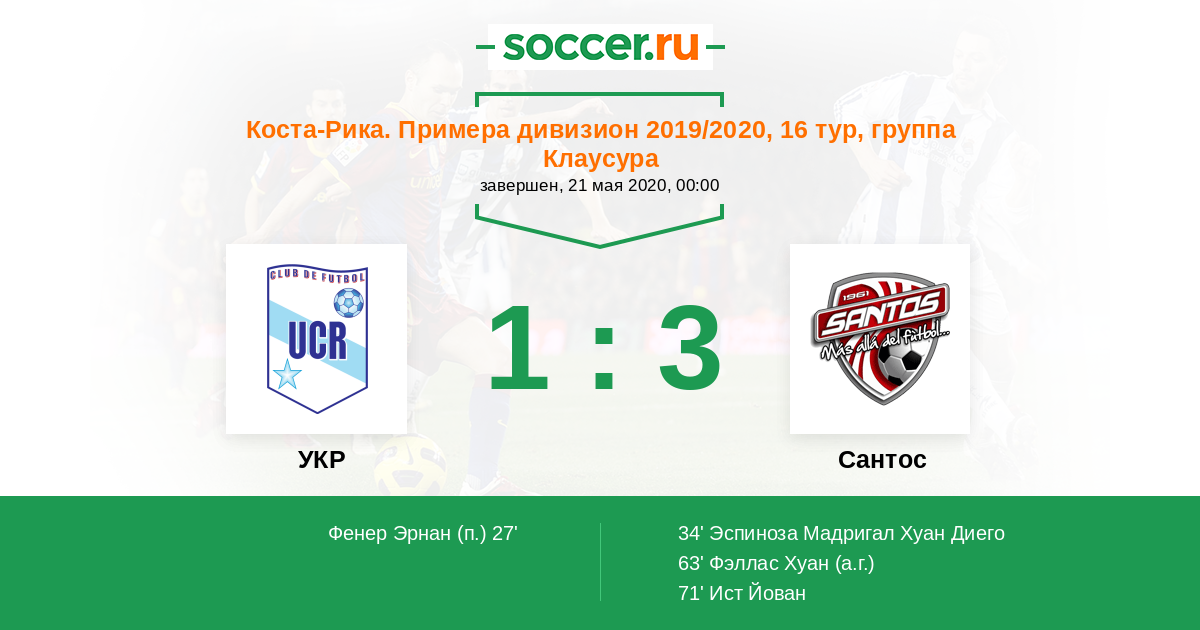 Коста-Рика. Примера дивизион 19.03.2016 УКР Логотип футбольный клуб УКР (Сан Хосе) 1:0 Логотип футбольный клуб Сантос (Гуапилес) Сантос