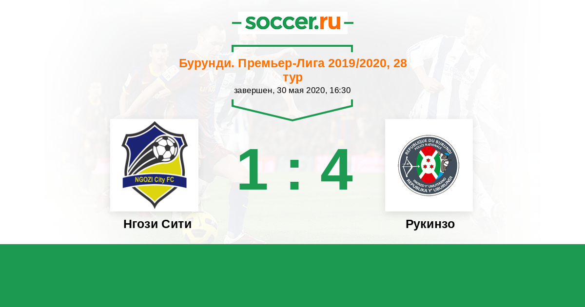 Бурунди. Премьер-лига 30.05.2020 Нгози Сити Логотип футбольный клуб Нгози Сити (Мвумба) 1:4 Логотип футбольный клуб Рукинзо (Бужумбура) Рукинзо