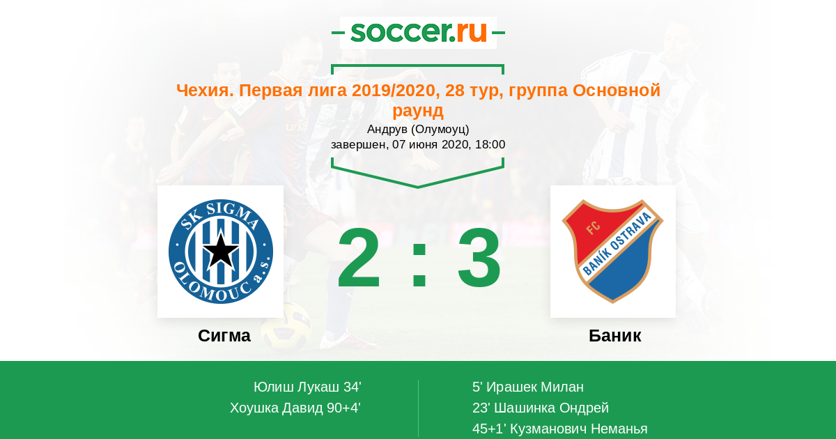 Чехия. Первая Лига 30.04.2023 Сигма Логотип футбольный клуб Сигма (Оломоуц) 1:4 Логотип футбольный клуб Баник (Острава) Баник