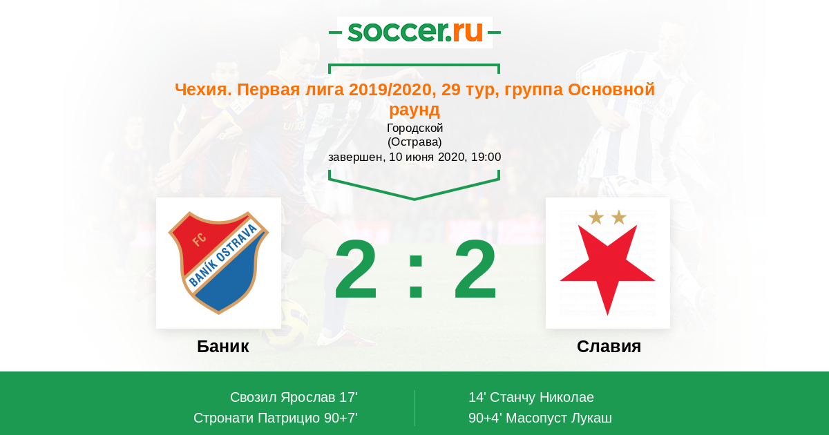 Чехия. Первая Лига 20.06.2020 Баник Логотип футбольный клуб Баник (Острава) 1:3 Логотип футбольный клуб Славия (Прага) Славия