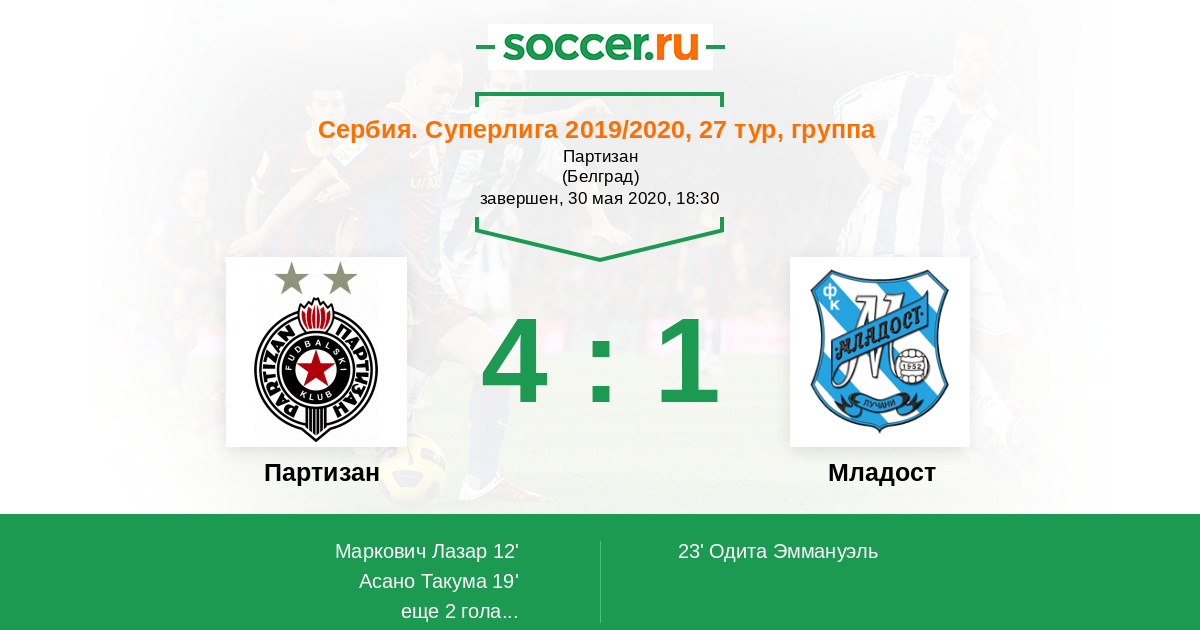 Сербия. Суперлига 01.05.2019 Партизан Логотип футбольный клуб Партизан (Белград) 2:1 Логотип футбольный клуб Младост (Лучани) Младост