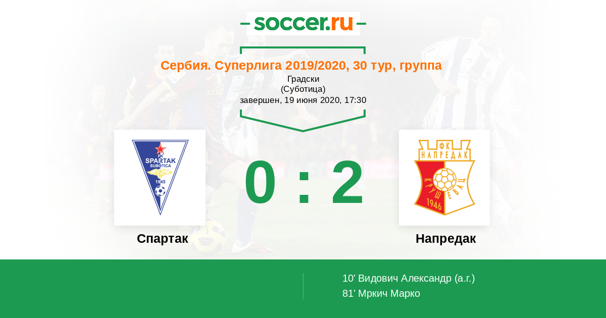 Сербия. Суперлига 18.04.2021 Спартак Суботица Логотип футбольный клуб Спартак Суботица 0:2 Логотип футбольный клуб Напредак (Крушевац) Напредак