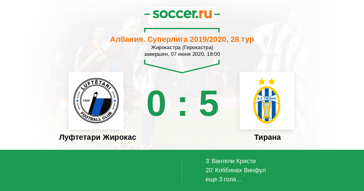 Албания. Суперлига 26.01.2020 Тирана Логотип футбольный клуб Тирана 5:1 Логотип футбольный клуб Луфтетари Жирокас (Жирокастер) Луфтетари Жирокас
