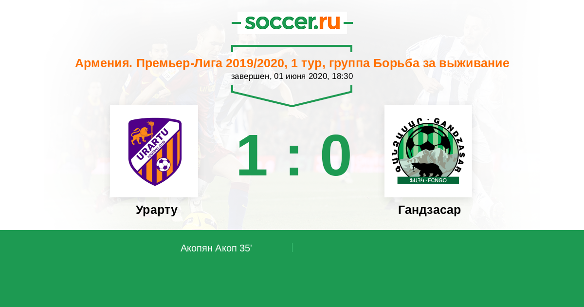 Армения. Премьер-лига 17.06.2020 Гандзасар Логотип футбольный клуб Гандзасар (Капан) 1:1 Логотип футбольный клуб Урарту (Ереван) Урарту