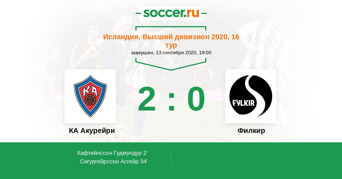Исландия. Высший дивизион 28.09.2019 КА Акурейри Логотип футбольный клуб КА Акурейри 4:2 Логотип футбольный клуб Филкир (Рейкьявик) Филкир