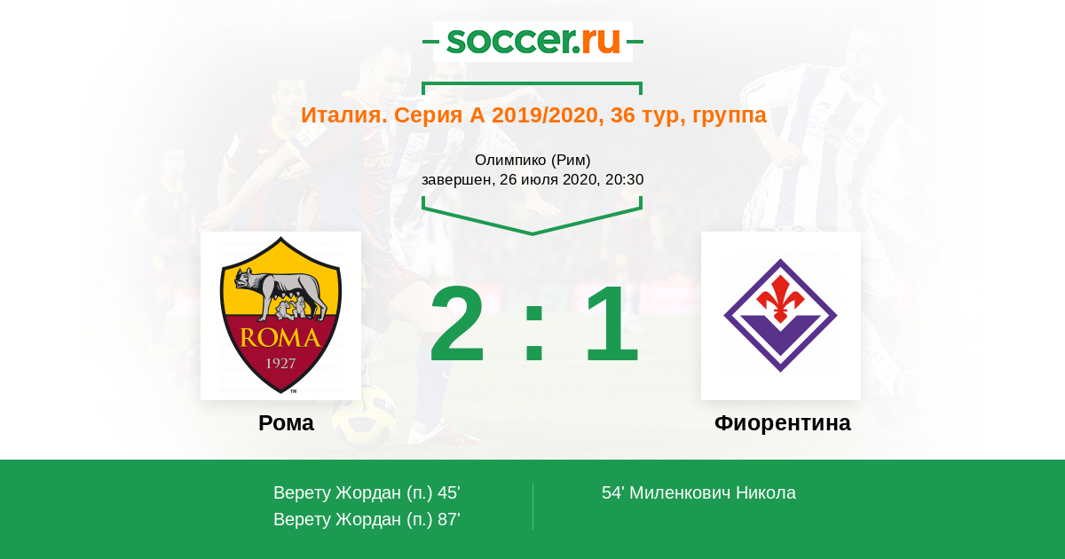 Италия. Серия А 01.11.2020 Рома Логотип футбольный клуб Рома (Рим) 2:0 Логотип футбольный клуб Фиорентина (Флоренция) Фиорентина