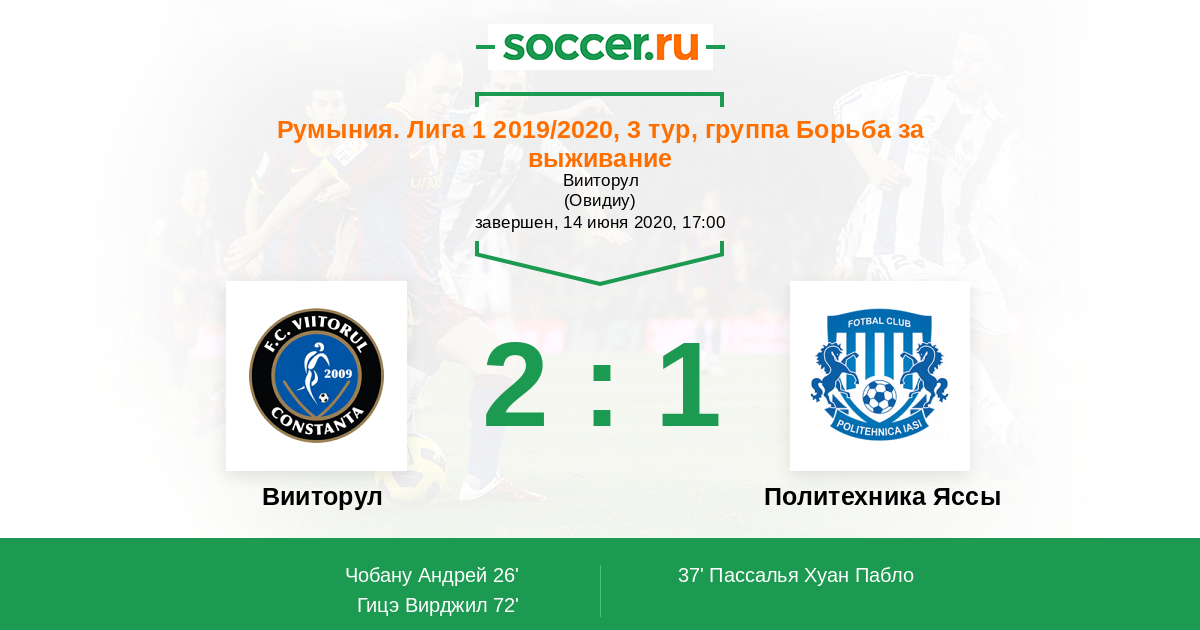 Румыния. Лига 1 20.07.2020 Политехника Яссы Логотип футбольный клуб Политехника Яссы 1:1 Логотип футбольный клуб Вииторул (Констанца) Вииторул