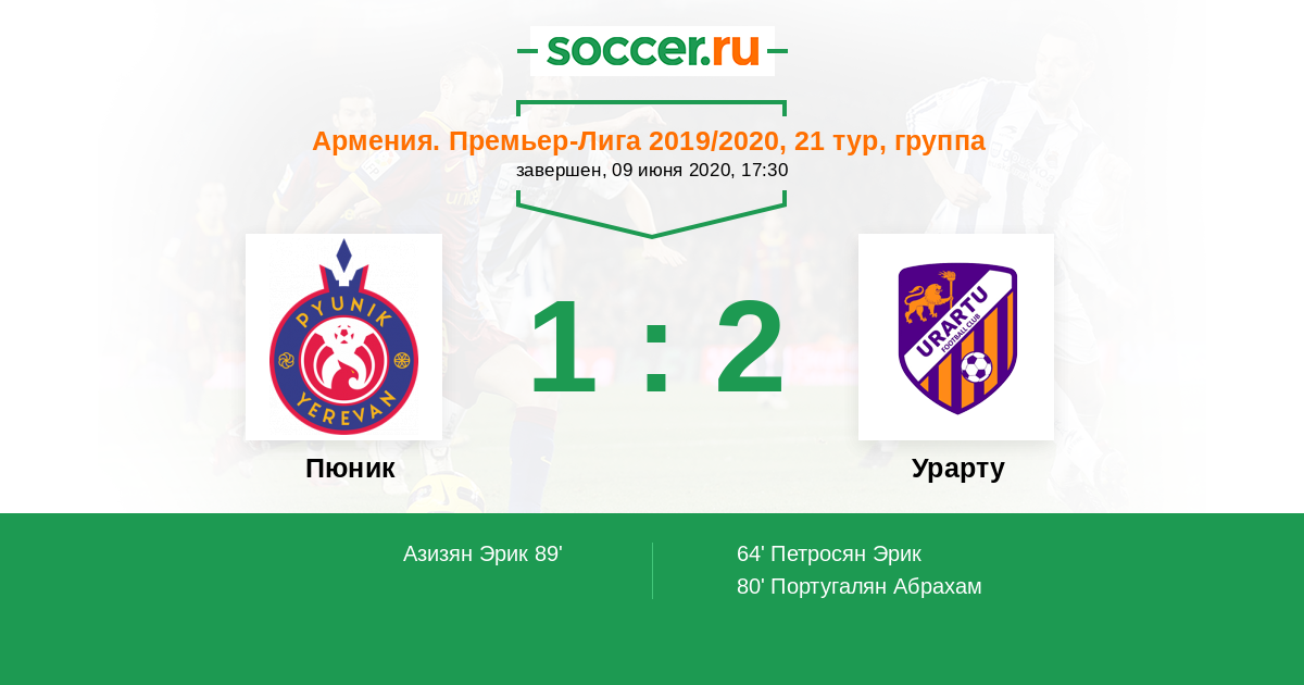 Армения. Премьер-лига 28.06.2020 Урарту Логотип футбольный клуб Урарту (Ереван) 0:1 Логотип футбольный клуб Пюник (Ереван) Пюник
