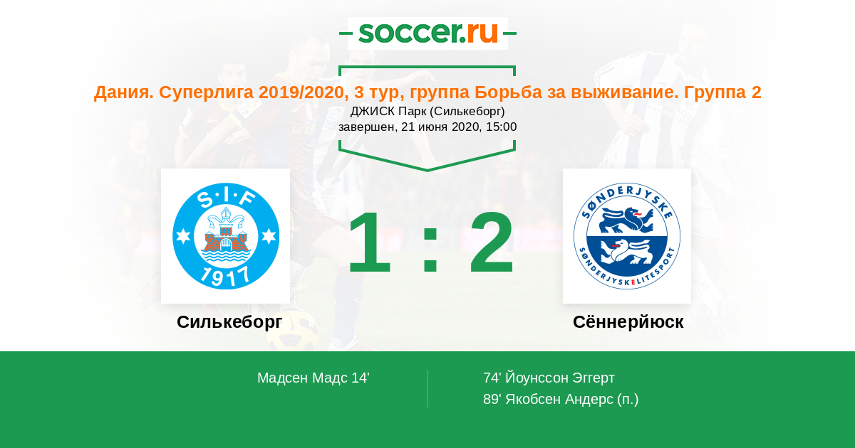 Дания. Суперлига 27.06.2020 Сённерйюск Логотип футбольный клуб Сённерйюск (Хадерслев) 1:0 Логотип футбольный клуб Силькеборг Силькеборг