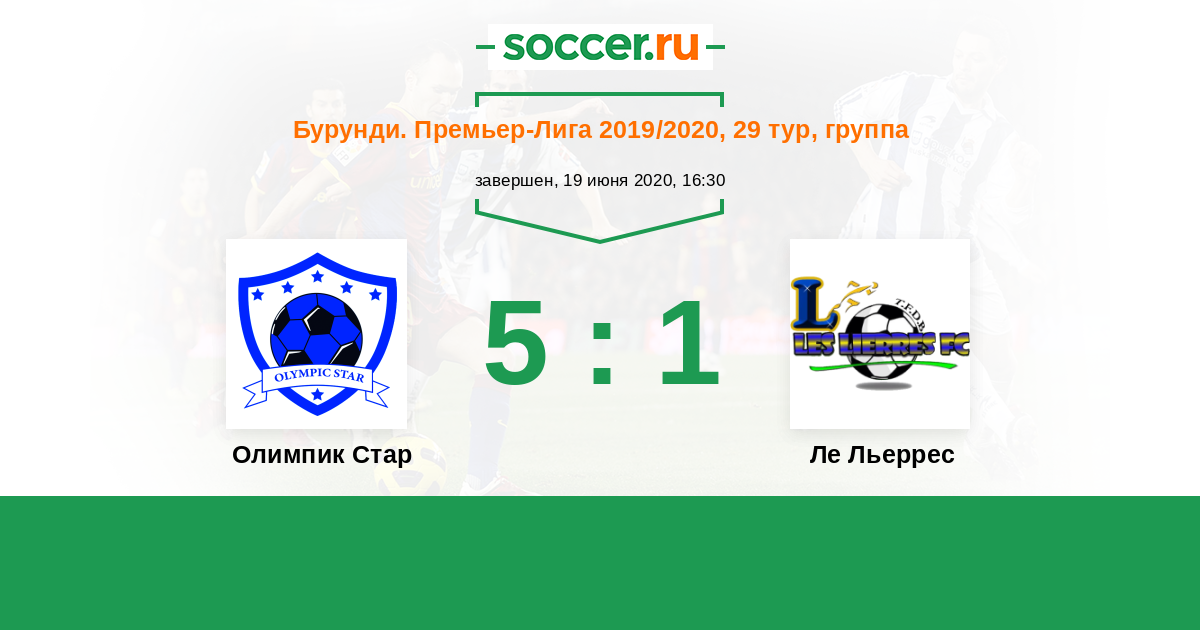 Бурунди. Премьер-лига 19.06.2020 Олимпик Стар Логотип футбольный клуб Олимпик Стар (Муйинга) 5:1 Логотип футбольный клуб Ле Льеррес (Бужумбура) Ле Льеррес