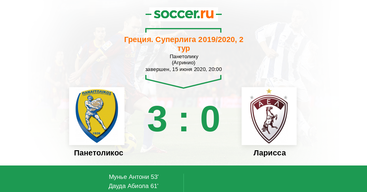Греция. Суперлига 03.04.2021 Ларисса Логотип футбольный клуб Ларисса 1:1 Логотип футбольный клуб Панетоликос (Агринио) Панетоликос