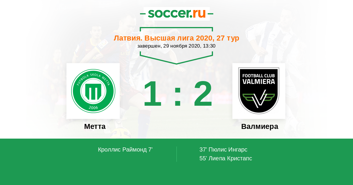 Латвия. Высшая лига 13.09.2020 Валмиера Логотип футбольный клуб Валмиера (Валмиера Гласс) 1:0 Логотип футбольный клуб Метта (Рига) Метта