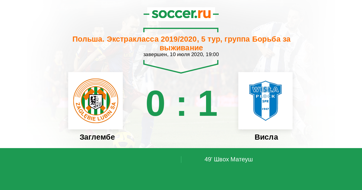 Польша. Экстракласса 13.09.2019 Заглембе Логотип футбольный клуб Заглембе (Любина) 5:0 Логотип футбольный клуб Висла (Плоцк) Висла