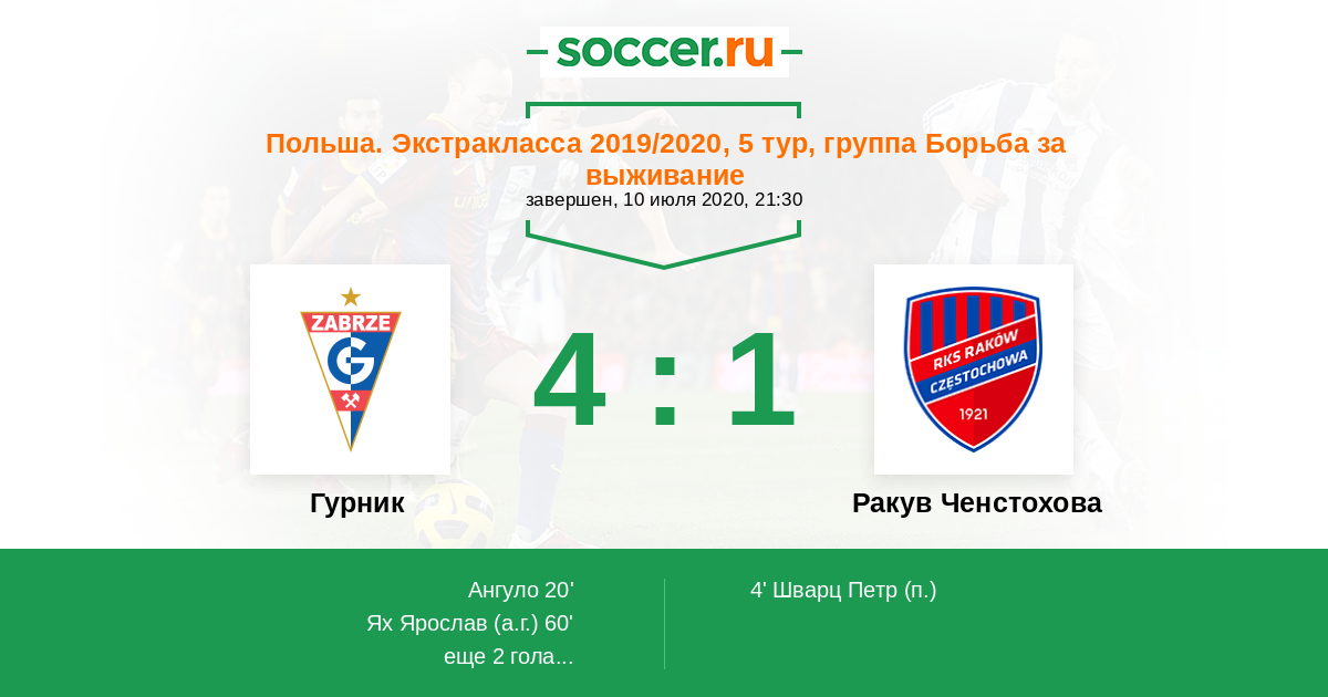 Польша. Экстракласса 17.10.2020 Гурник Логотип футбольный клуб Гурник (Забже) 1:3 Логотип футбольный клуб Ракув Ченстохова Ракув Ченстохова