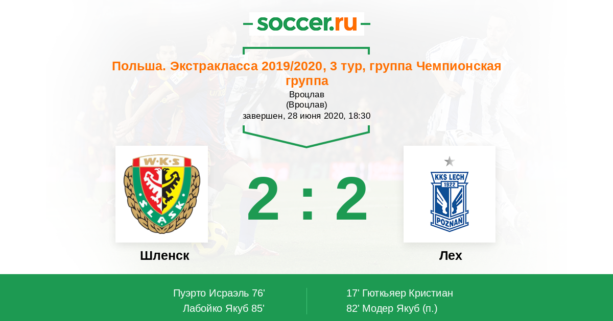 Польша. Экстракласса 12.09.2020 Шленск Логотип футбольный клуб Шленск (Вроцлав) 3:3 Логотип футбольный клуб Лех (Познань) Лех