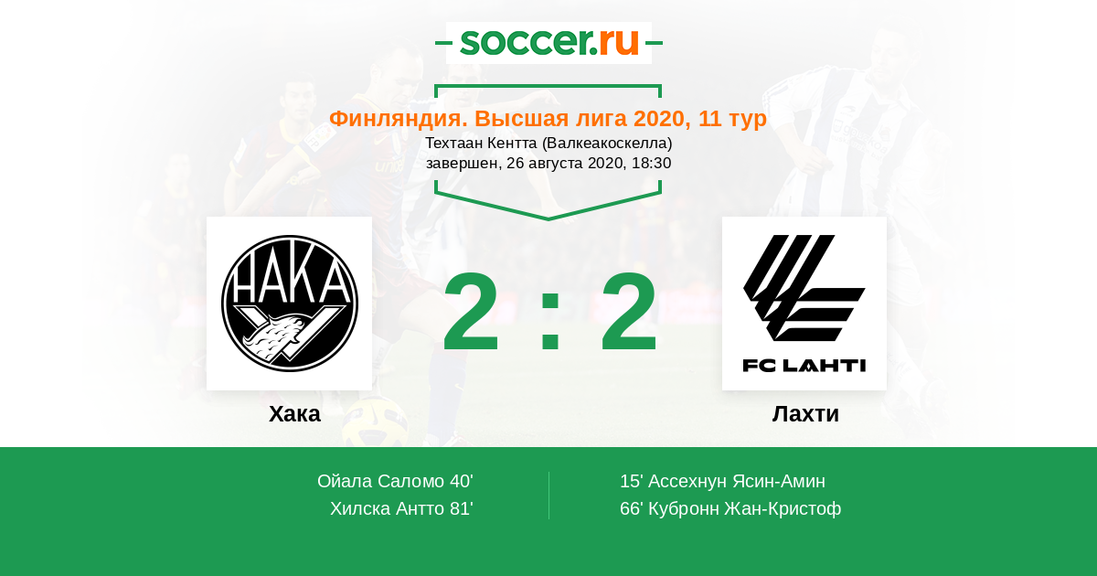 Финляндия. Высшая лига 19.10.2020 Лахти Логотип футбольный клуб Лахти 0:0 Логотип футбольный клуб Хака (Валкеакоски) Хака