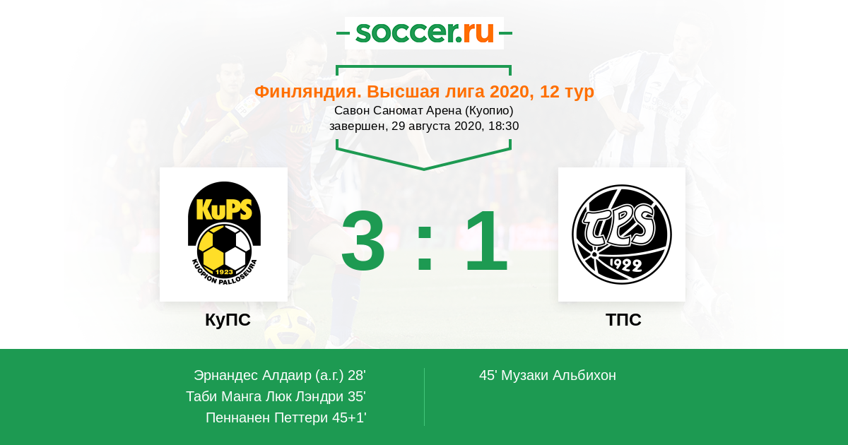 Финляндия. Высшая лига 05.08.2018 КуПС Логотип футбольный клуб КуПС (Купио) 3:2 Логотип футбольный клуб ТПС (Турку) ТПС